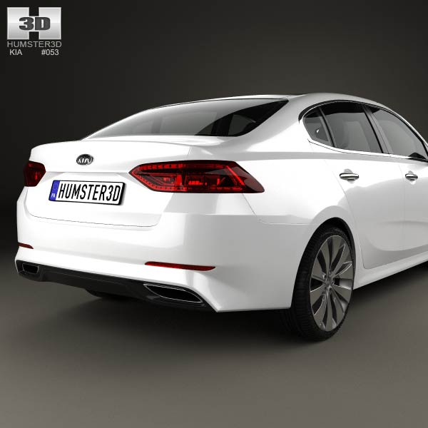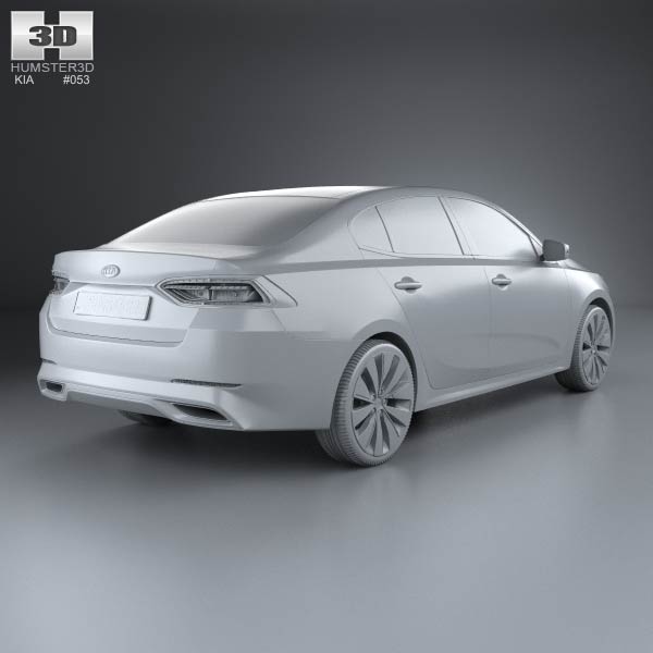 The Kia K4 2014 3D model depicts a streamlined body with angular headlights and alloy wheels. It is designed in bright white, suitable for various urban or suburban 3D scenes.