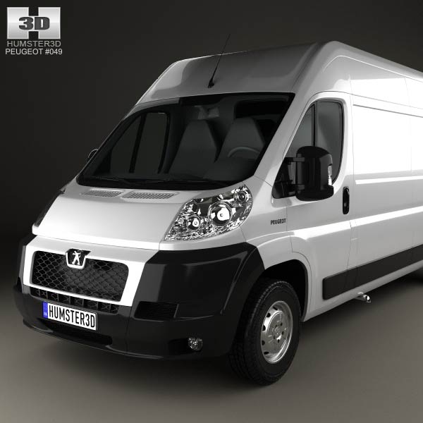 The Peugeot Boxer Panel Van 2007 3D model has a robust boxy silhouette and a predominantly white exterior with a black lower section. It emphasizes large side windows that provide visibility and a functional aesthetic with rounded headlights.