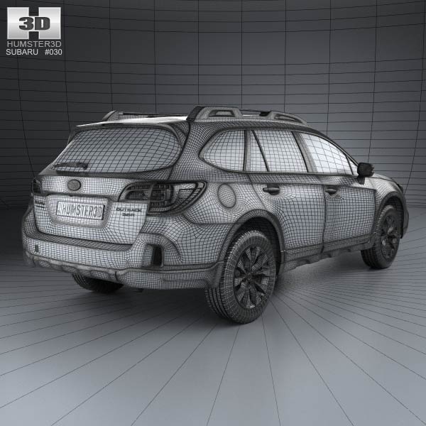 The 2015 Subaru Outback 3D model displays a robust design with an elongated body and elevated ground clearance. Its sharp lines and prominent wheel arches contribute to a dynamic profile suitable for various 3D scenes.