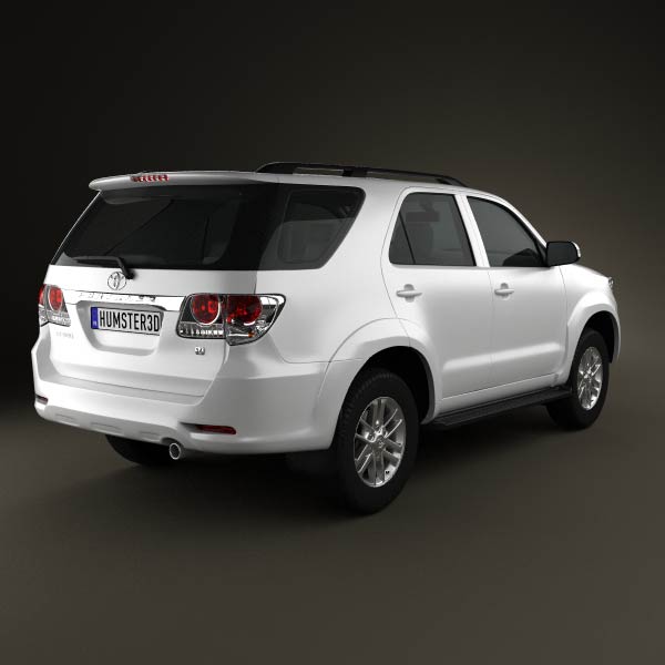 The Toyota Fortuner 2012 3D model has a robust silhouette with high ground clearance and pronounced wheel arches. Its bright white exterior and angular headlights create a distinct front profile.