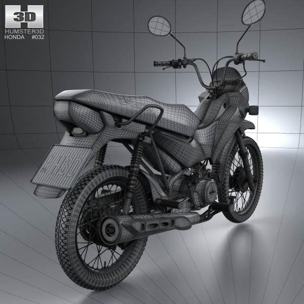 The Honda POP 100 2012 3D model has a compact design in deep teal with a black seat and accents. It contains spoked wheels and an upright riding posture, suitable for various urban environments.