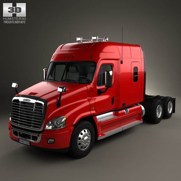 The Freightliner Cascadia XT Tractor Truck 2007 3D model comes with a robust cab design with smooth contours and a prominent roofline. The red exterior includes chrome accents, and the truck includes dual side mirrors and roof-mounted antennas for functionality.